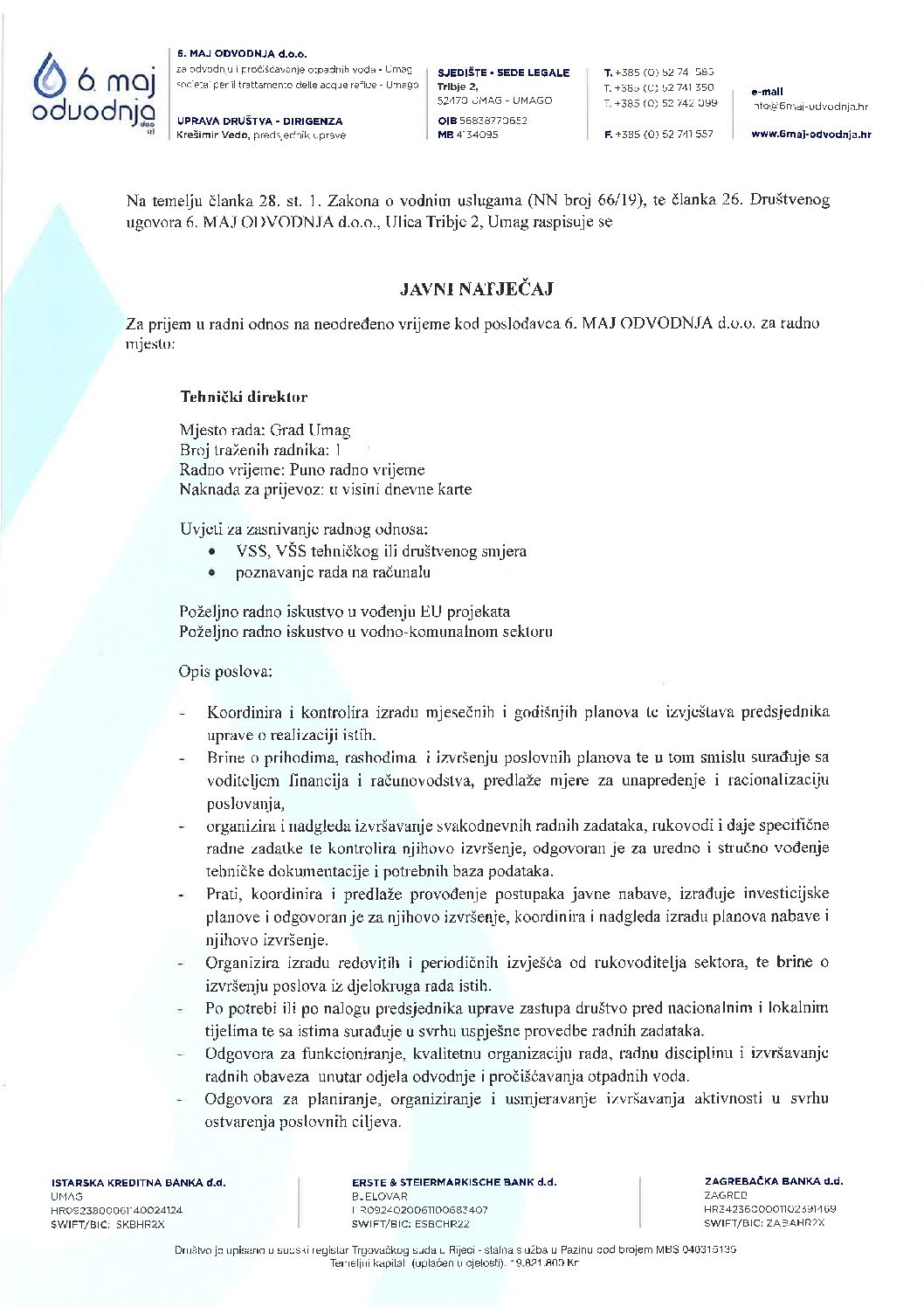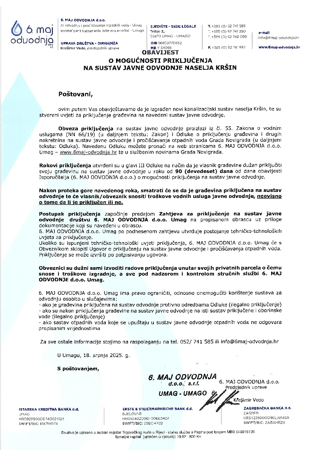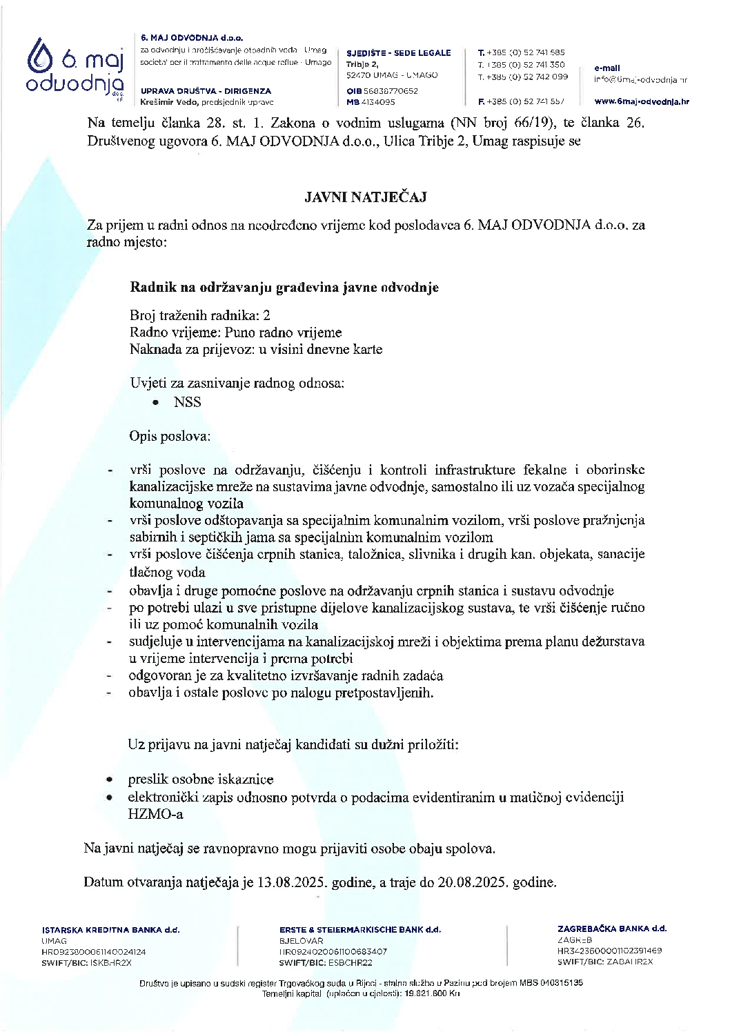 Trgovačko društvo 6. MAJ ODVODNJA d.o.o. Umag, Ulica Tribje 2, je trgovačko društvo sa ograničenom odgovornošću, u vlasništvu svih gradova i općina sa područja cijele Bujštine. Gradovi vlasnici i korisnici usluga našeg društva su gradovi Umag – Umago, Novigrad – Cittanova, Buje – Buie te općine Brtonigla – Verteneglio, Grožnjan-Grisignana i Oprtalj-Portole. Svojim uslugama društvo opslužuje čitav teritorij sjeverno od rijeke Mirne, pa sve do Dragonje, odnosno do granice sa Slovenijom. Predmet poslovanja društva sastoji se u obavljanju djelatnosti javne odvodnje. Sa danom 01.01.2023. godine u društvu je 27 stalno zaposlenih djelatnika, koji svojim radom i trudom imaju za cilj pružati što kvalitetniju uslugu na ekološki prihvatljiv način u granicama područja gradova i općina na kojem naše društvo djeluje.